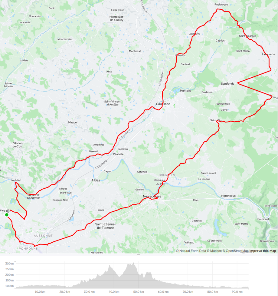 Parcours: Falguières, Petit Versailles, près Saint-Étienne-de-Tulmont, Négrepelisse, Bioule, Saint-Cirq, Les Granges, route de Septfonds, Lavaurette, Saint-Georges, Puylaroque-bas, Lapenche, Borredon, Caussade, Saint-Nazaire, Cos, Lamothe-Capdeville, Loubéjac, Birac, Falguières.
