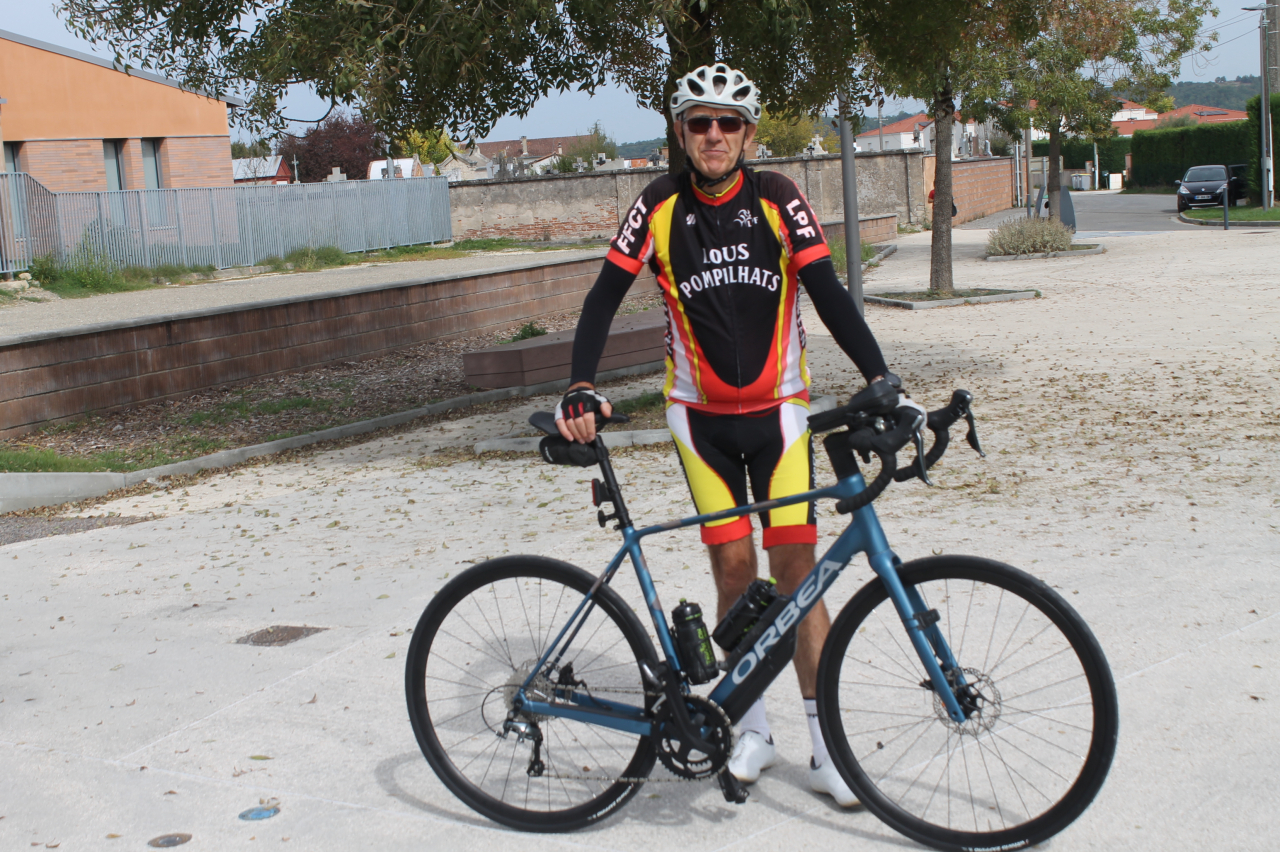 Vendredi 3 octobre 14h00, 12 cyclos au départ de Falguières: Charles A., Didier B., Francis N., Henry C., Hervé H., Jean-Louis A., Jean-Pierre G., Jean-Pierre R., Louis P., Michel L., Régis C. et un nouveau que malheureusement nous avons perdu route de l'Aveyron... Direction Montbartier et Labastide-Saint-Pierre, retour par Villebrumier et Saint-Martial. Régis a pu tester son nouveau vélo (photo) sur la deuxième partie du parcours.