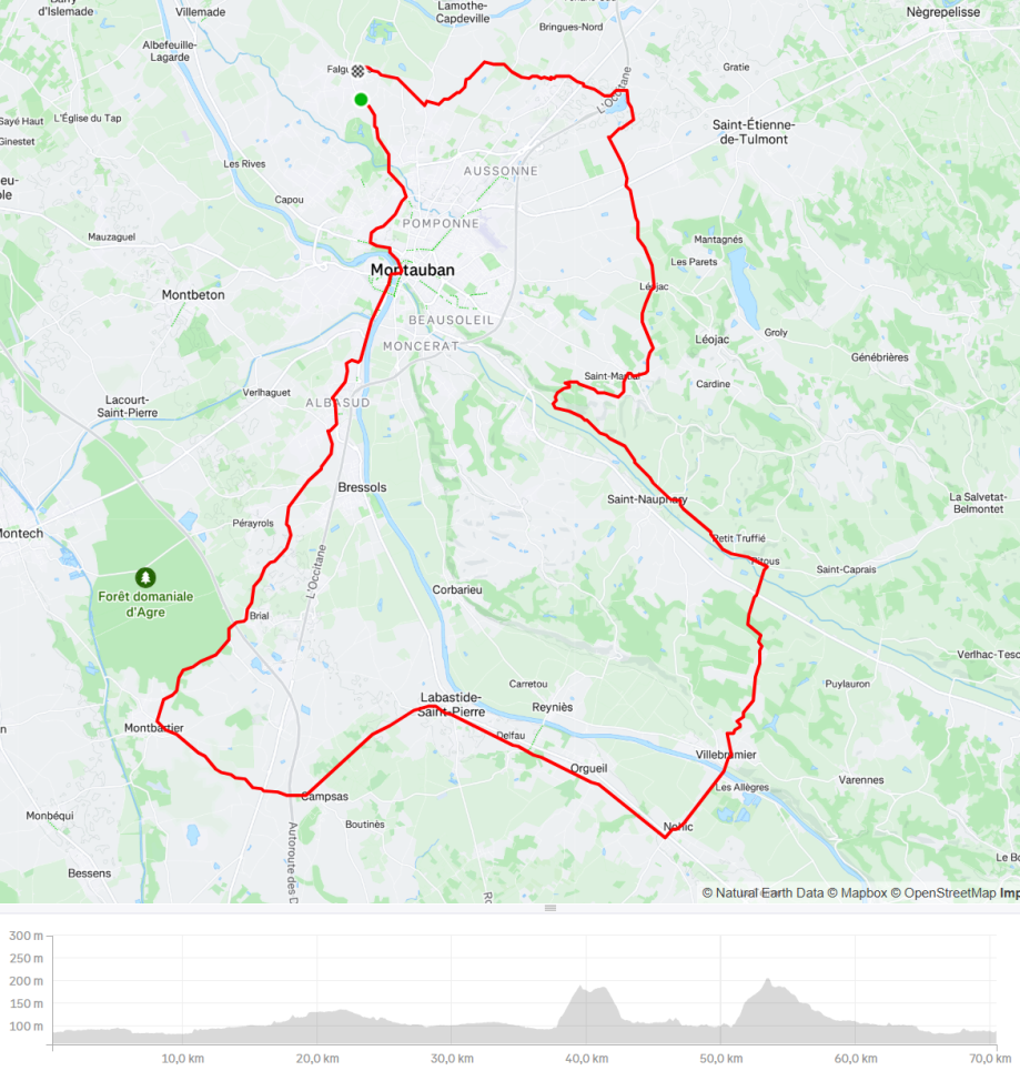 Parcours: Falguières, Pont Vieux, Albasud, Brial, Montbartier, près Campsas, Labastide-Saint-Pierre, voix verte, Nohic, Villebrumier, Saint-Nauphary, côte de la riblaye, Saint-Martial, Léojac-bas, chemin de ceinture, Fonneuve, Birac, Falguières.