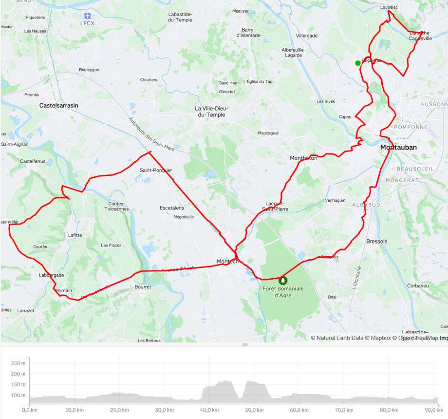 Parcours: Falguières, Pont Vieux, Albasud, la forêt, Montech, voie verte du canal, Saint-Porquier, Les Estraquès, Garganvilar, Labourgade, Montaïn, Bourret-haut, Montech, Lacourt-Saint-Pierre, Montbeton, Gasseras, Pont de l'Avenier, chemin Saint-Pierre, Falguières.